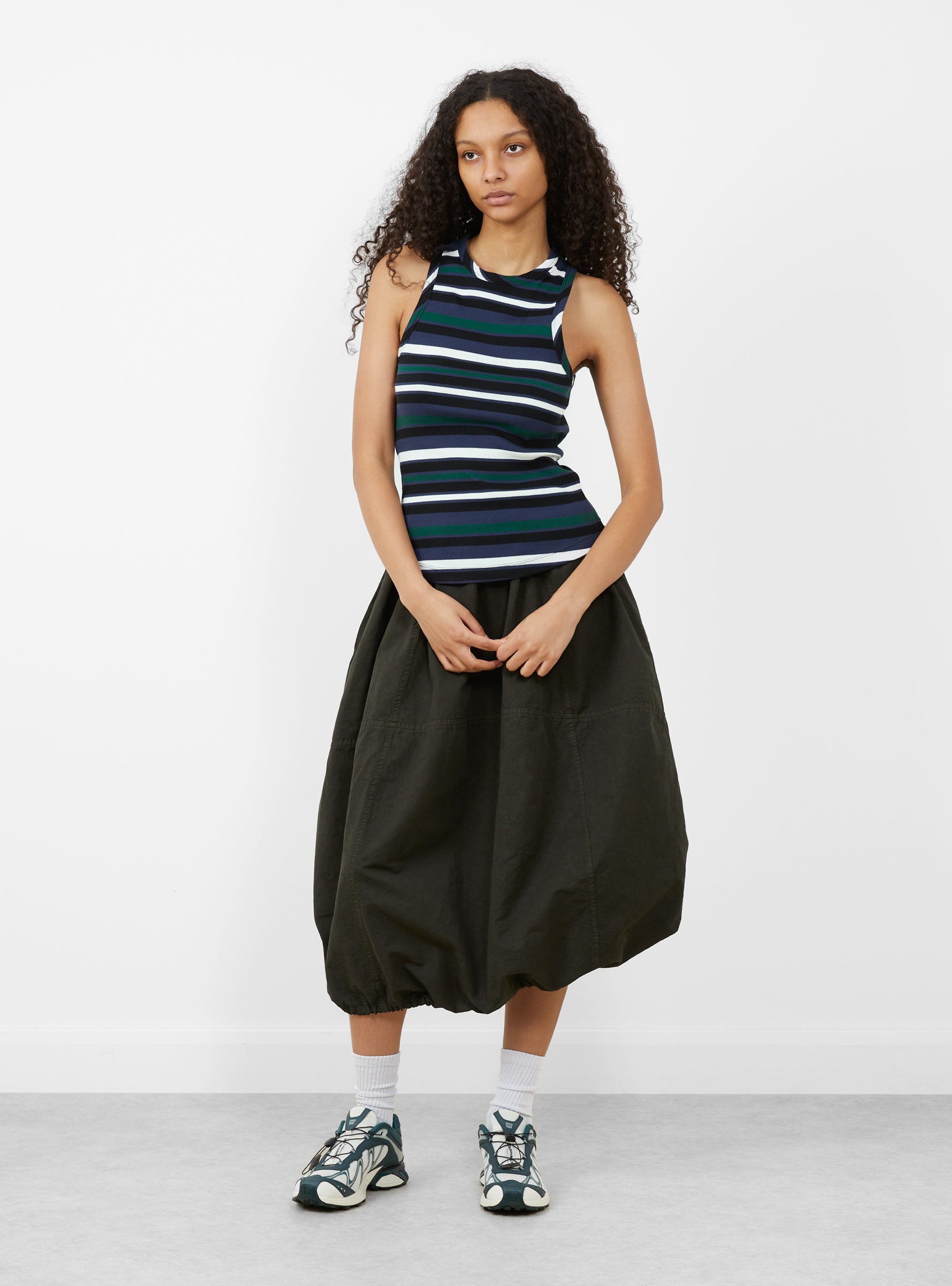 The Rainshine Vest comes in Multi from YMC and is made in Portugal from organic cotton jersey. Cut to a slim fit, this fitted vest features a ribbed finish with a multi tone stripe, a racer neckline and self fabric binding at the neck and armholes. Baseball-style top stitching and a curved hem complete the design.
