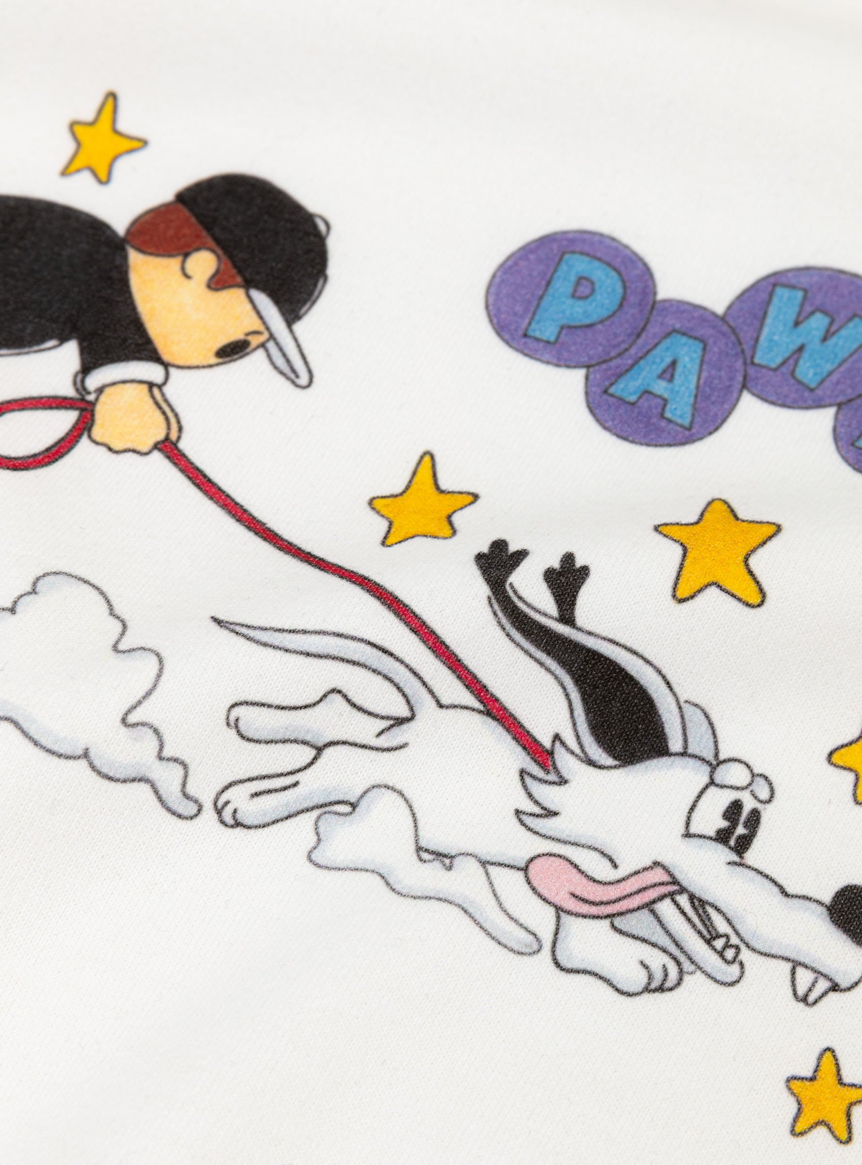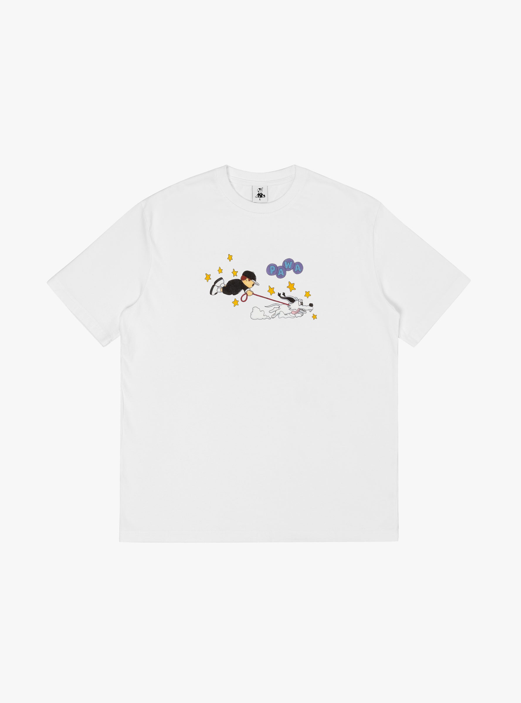 The Walkies T-Shirt White from Pawa Speed Sports is cut to a relaxed fit with a ribbed crewneck and short sleeves. It features a playful print of the Pawa boy taking the brands Doggo charater for a walk on the front.