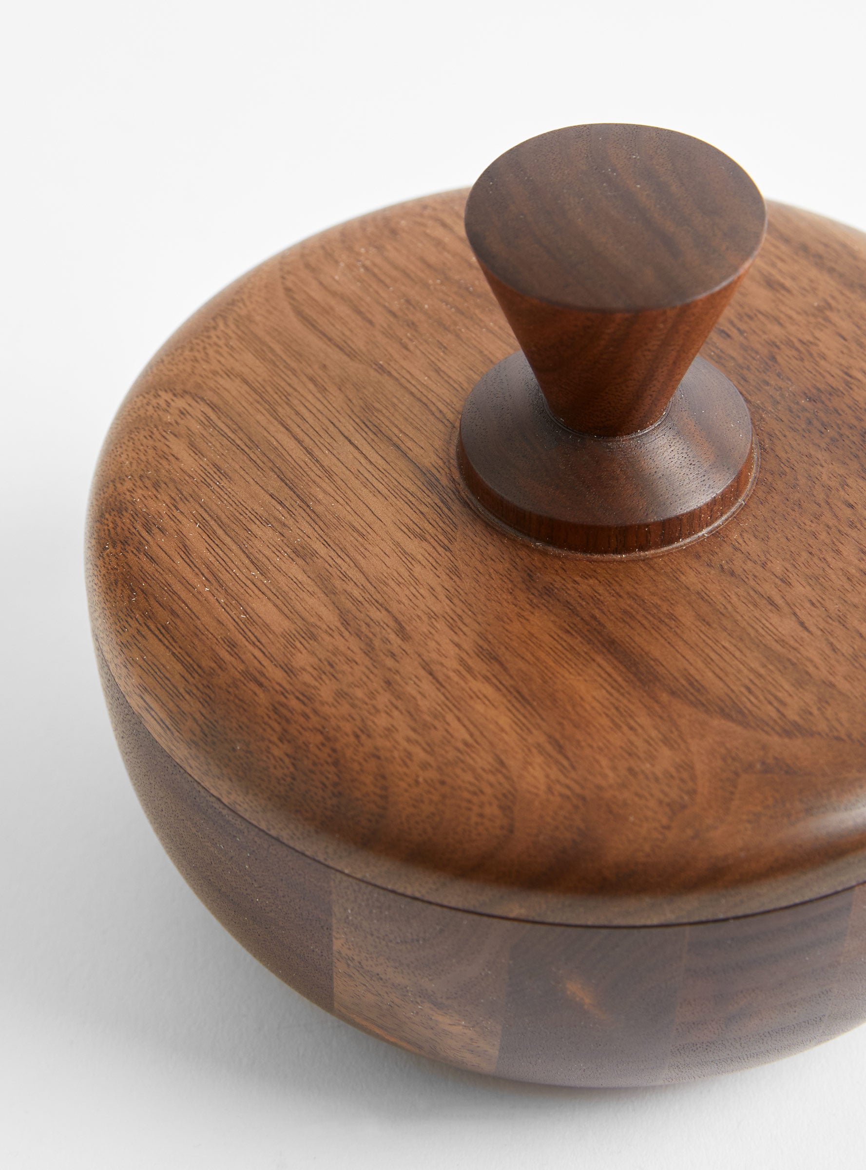 The Walnut S Bowl Container from Small Goods Design is crafted from wood with a triangle knob. The New York-based brand is operated by Sam Shippee — when designing Sam aims to investigate the subtle nuances of beauty and create objects that are as durable and functional as they are intriguing.