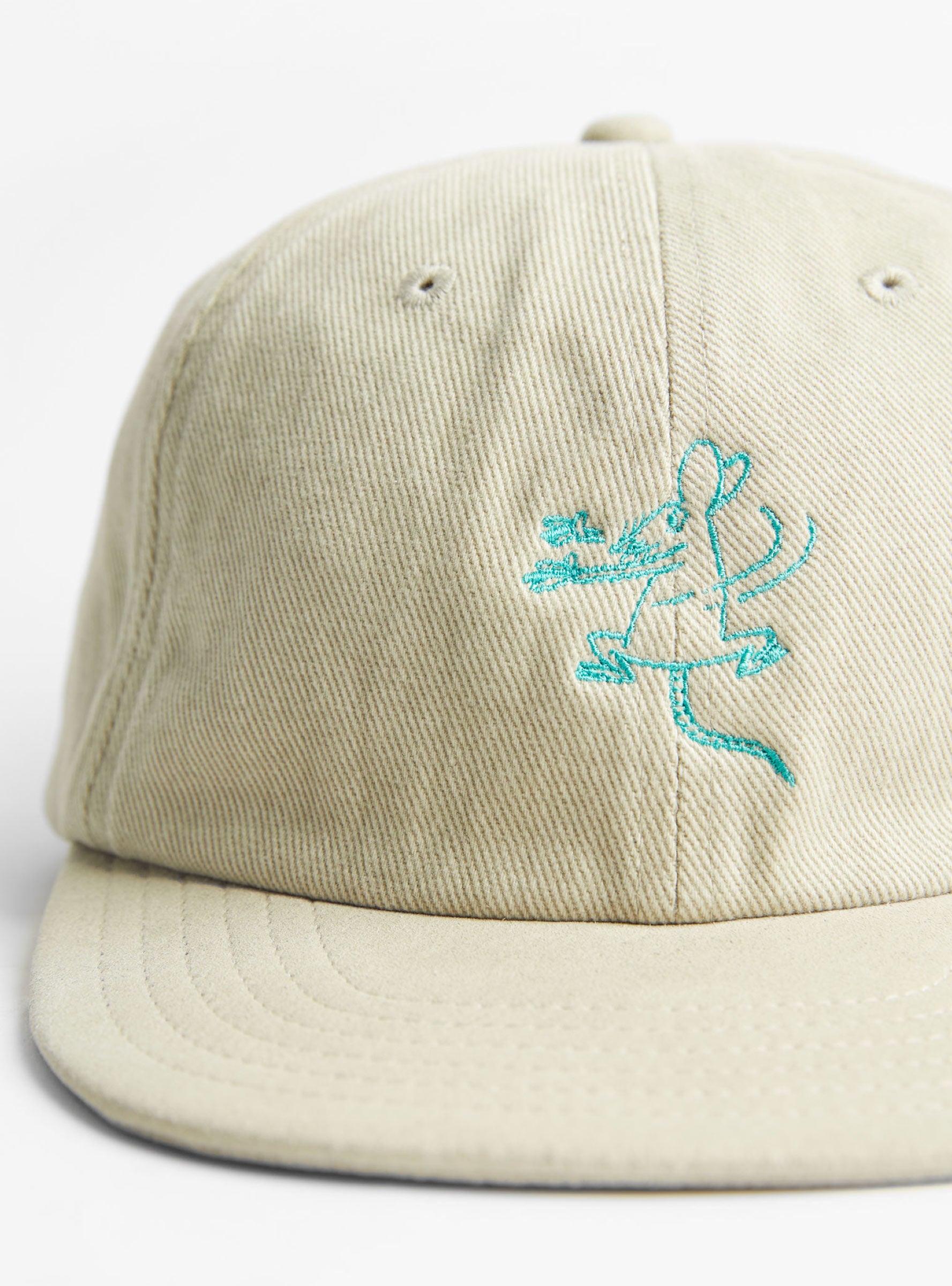 The Washed Cotton Rat Cap, made by Sublimeroe for TDR, comes in Off White and is crafted from cotton with a faded wash finish. It features a contrast embroidered rat motif and a structured brim.