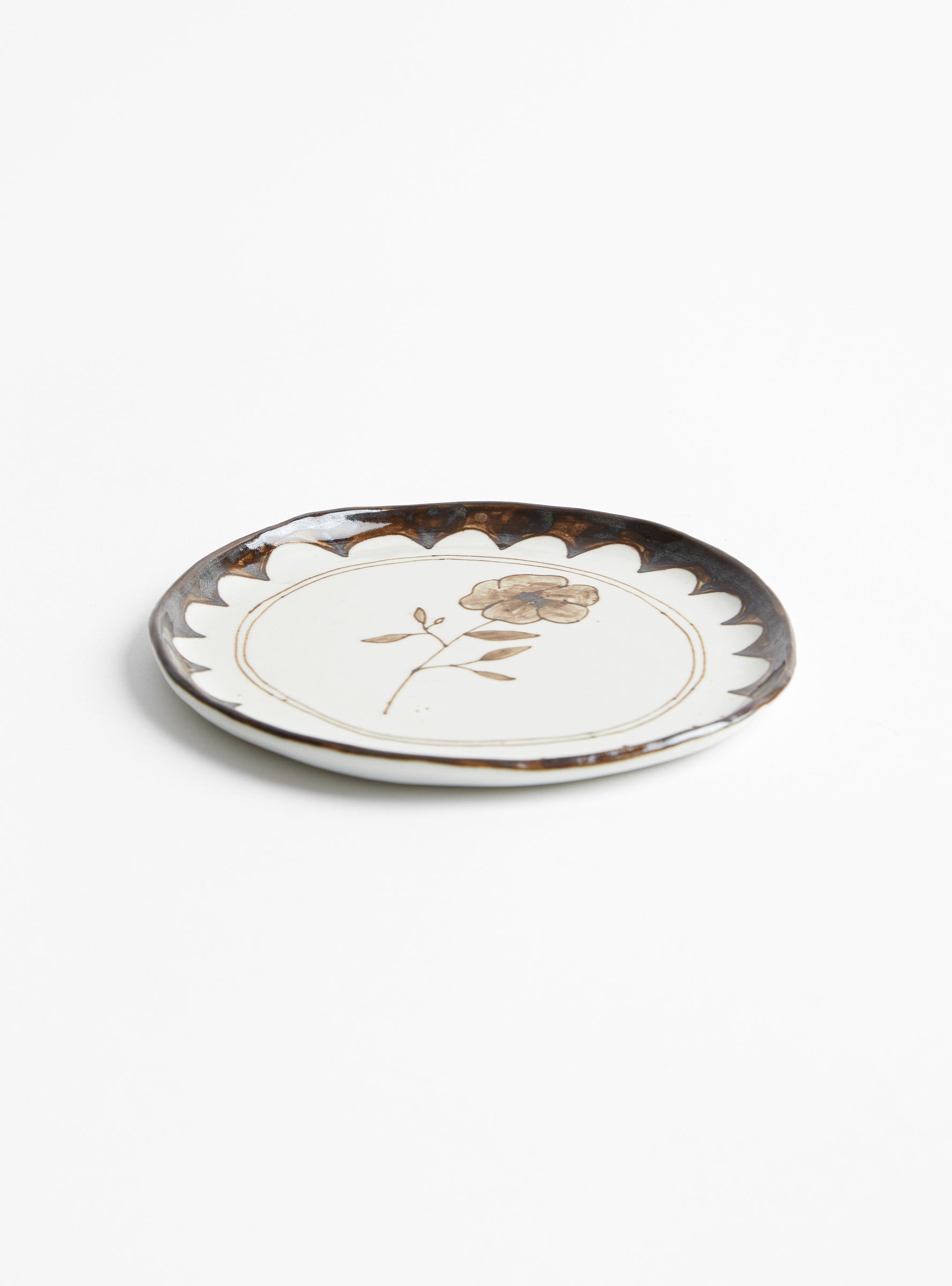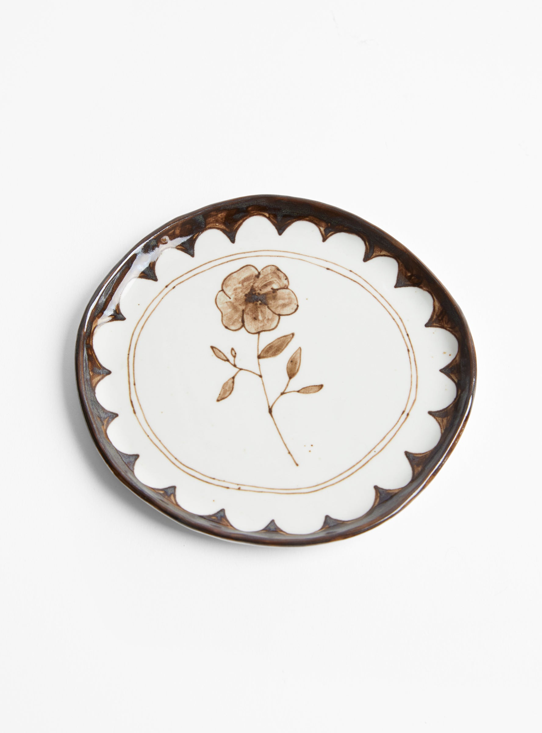 The Wild Rose Snack Plate 3 from Stephanie Dawn Matthias is made in the USA and hand-crafted from ceramic. Featuring a white base with a brown floral motif and a scalloped edge, this rounded plate brings a delicate, handcrafted touch to your table.