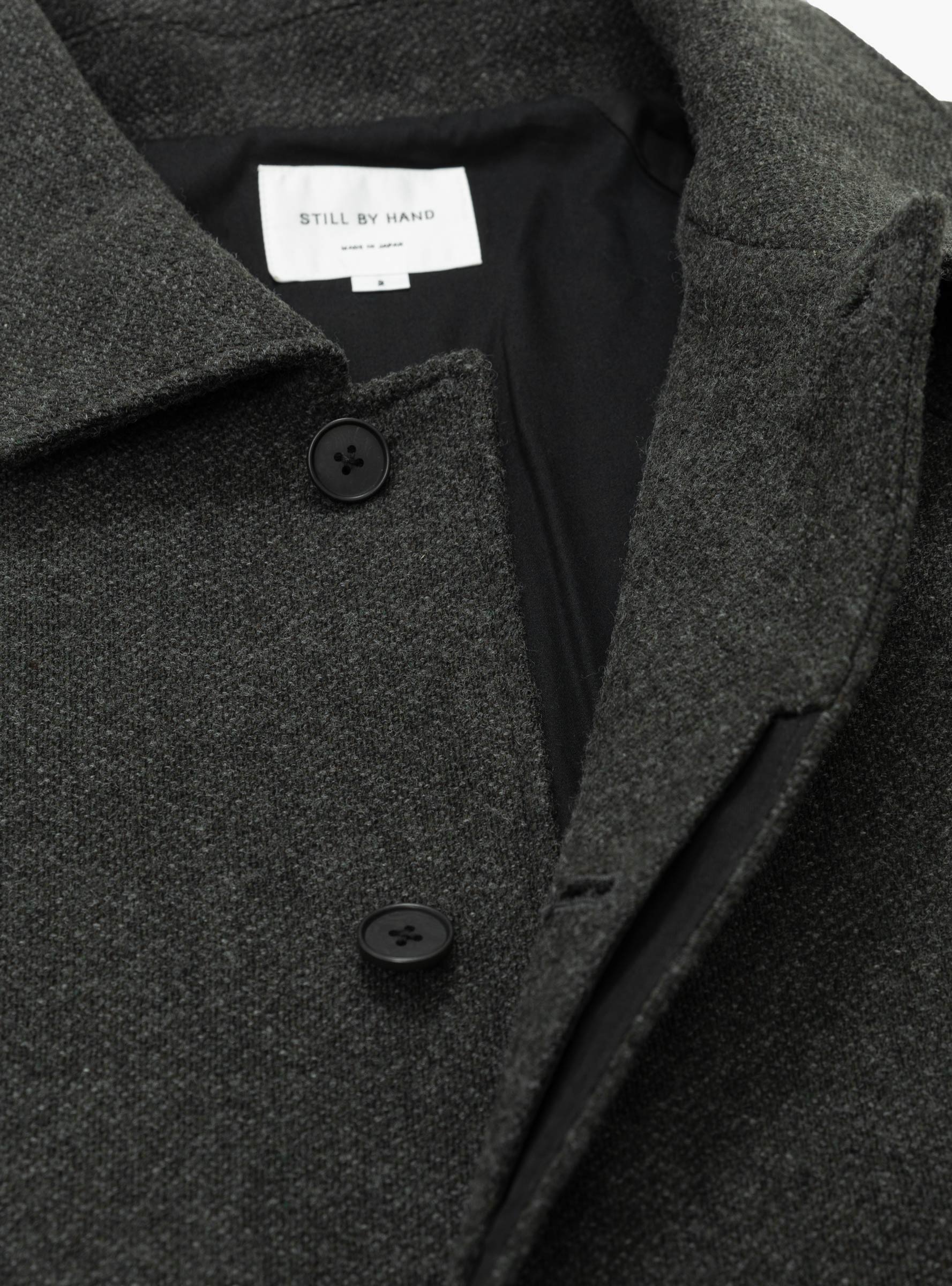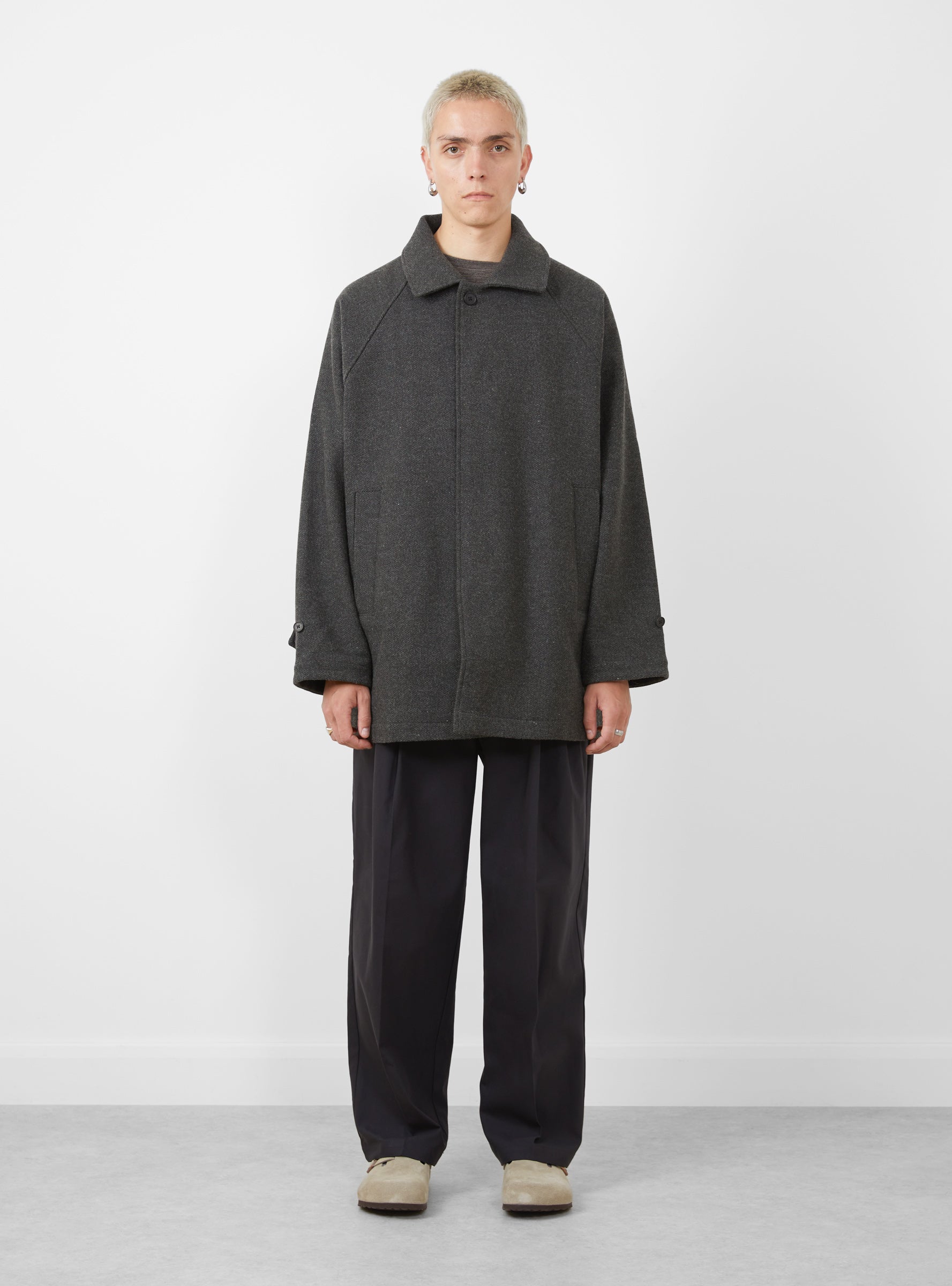 The Wool & Nylon Half Coat from Still By Hand arrives in a khaki grey colourway. Made in Japan the jacket takes a classic shape. A woollen outer ensures warmth, whilst a nylon lining offers comfort. A hidden button closure and raglan sleeves offer a clean finish on a jacket that takes after classic styles with cuffs at the sleeves and a vertical pleated detail at the back.