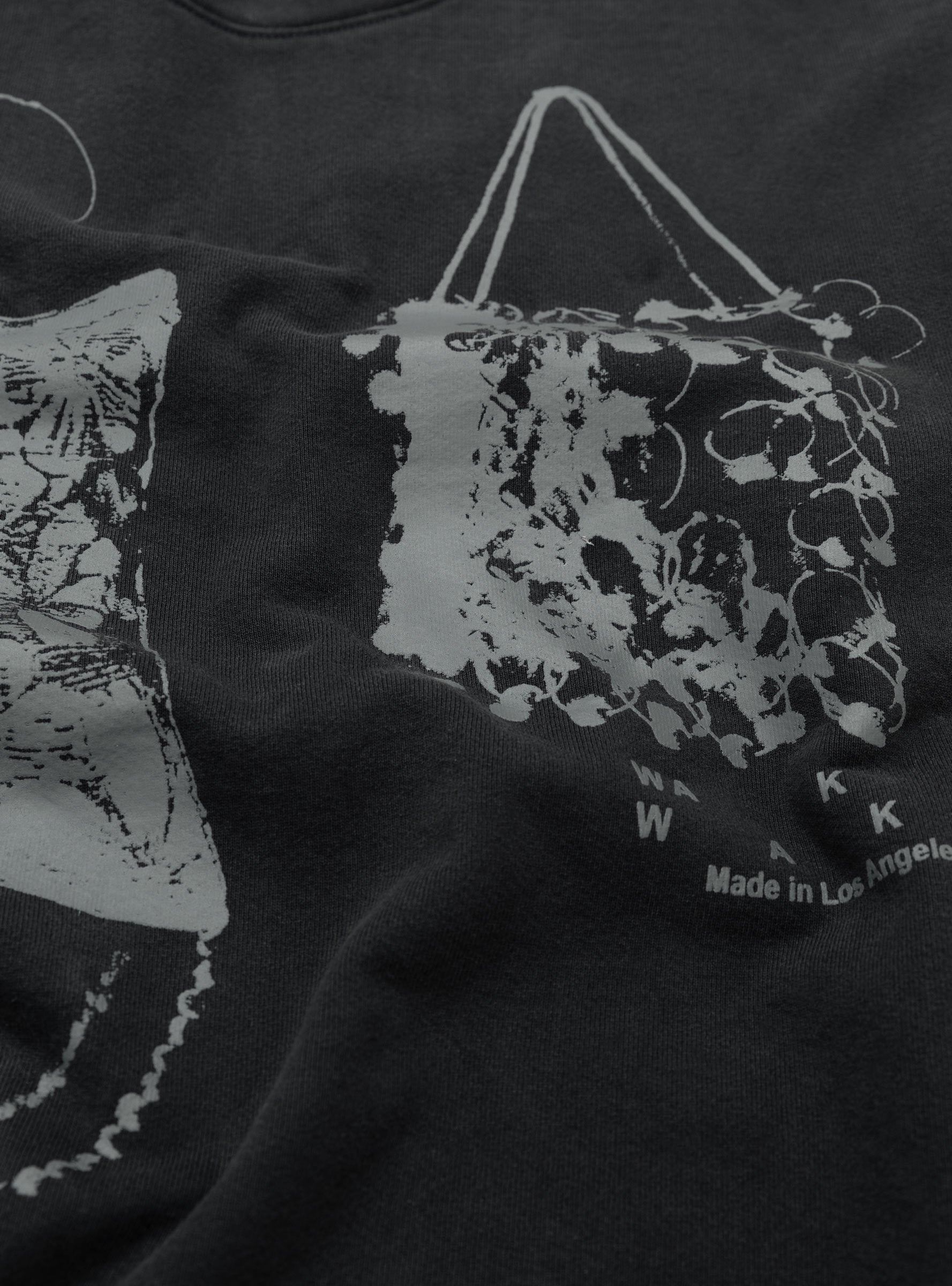 LA-based b.Eautiful collaborates with Japanese furniture maker Waka Waka on this Soft/Hard Sweatshirt in a washed black. Made and printed in Los Angeles from a 6.05oz cotton, the garment dyed sweatshirt falls to a regular fit and features custom graphics of Waka Waka furniture printed across the front and back.