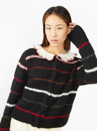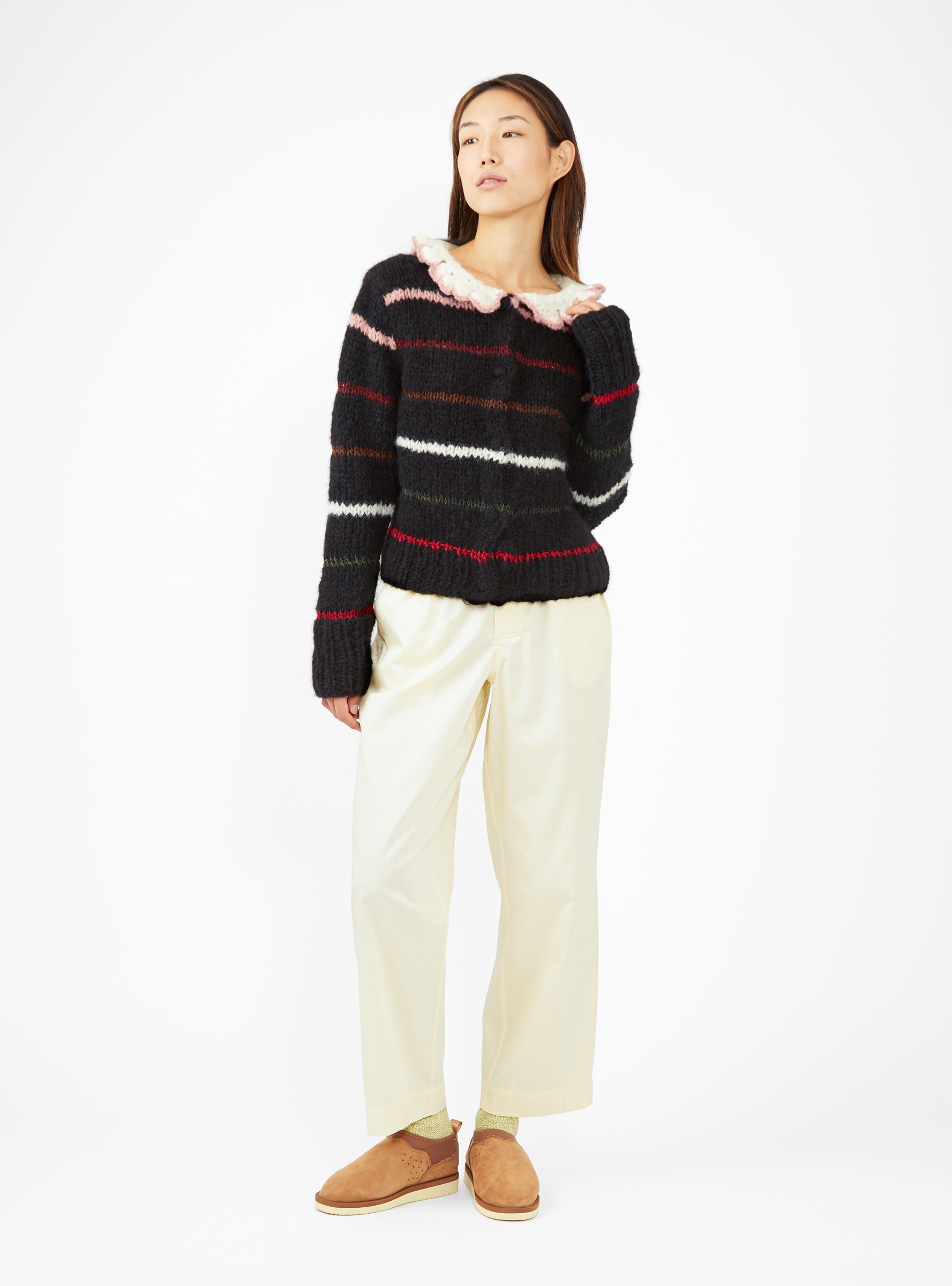 Made in Peru from alpaca-blend yarn, this black striped Yana cardigan from AYNI is knitted to a boxy silhouette with dropped shoulders and a scallop-edged collar.
